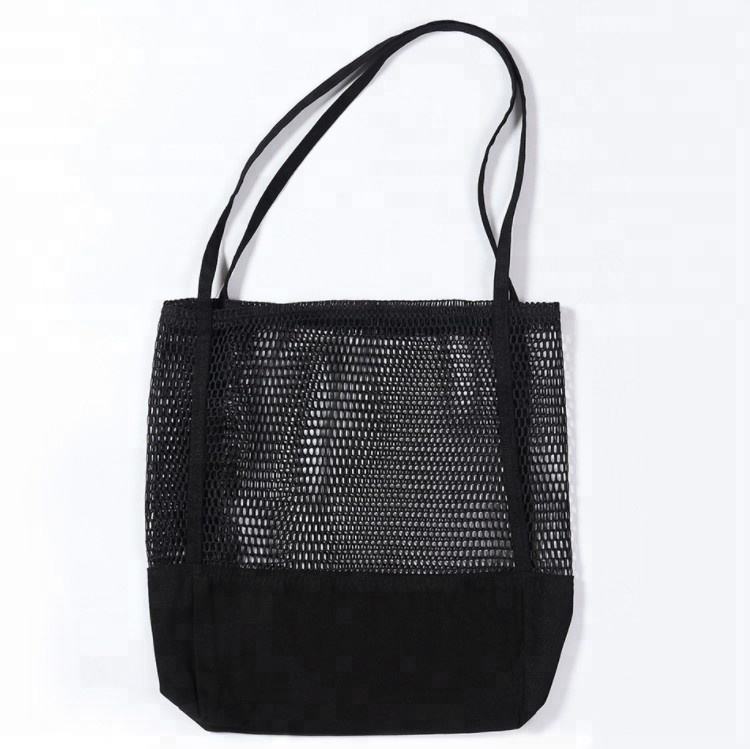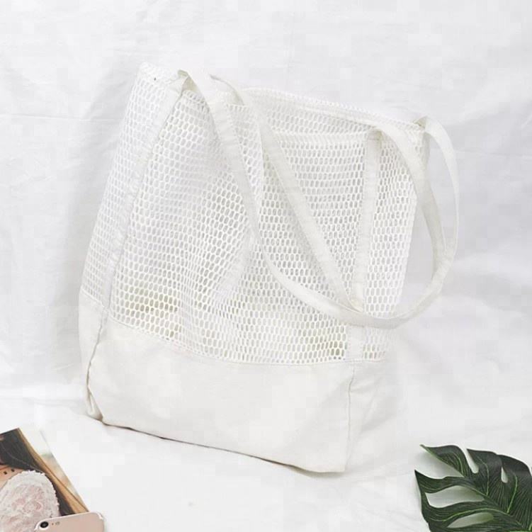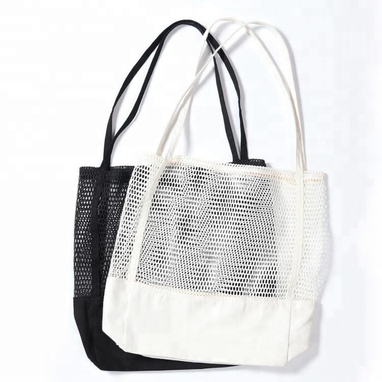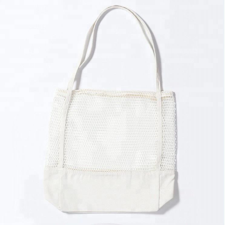 浜の再使用可能な安い網のキャンバスのトート バックの卸売りのショッピングの大きい綿は網のトート バックを運びます